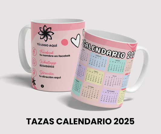Diseño calendario 2025 para tazas sublimacion de 11 oz, template editable PSD, tazas para negocios, descarga inmediata.